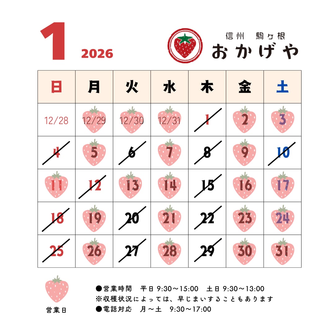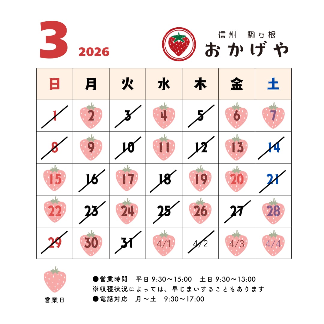 ・月曜日 9:30 〜 15:00・水曜日 9:30 〜 15:00・金曜日 9:30 〜 15:00・土曜日 9:30 〜 13:00●祝祭日も営業します●収穫状況や都合により変更することがありますので、ご確認ください※急用でない場合は、午後にお願いします